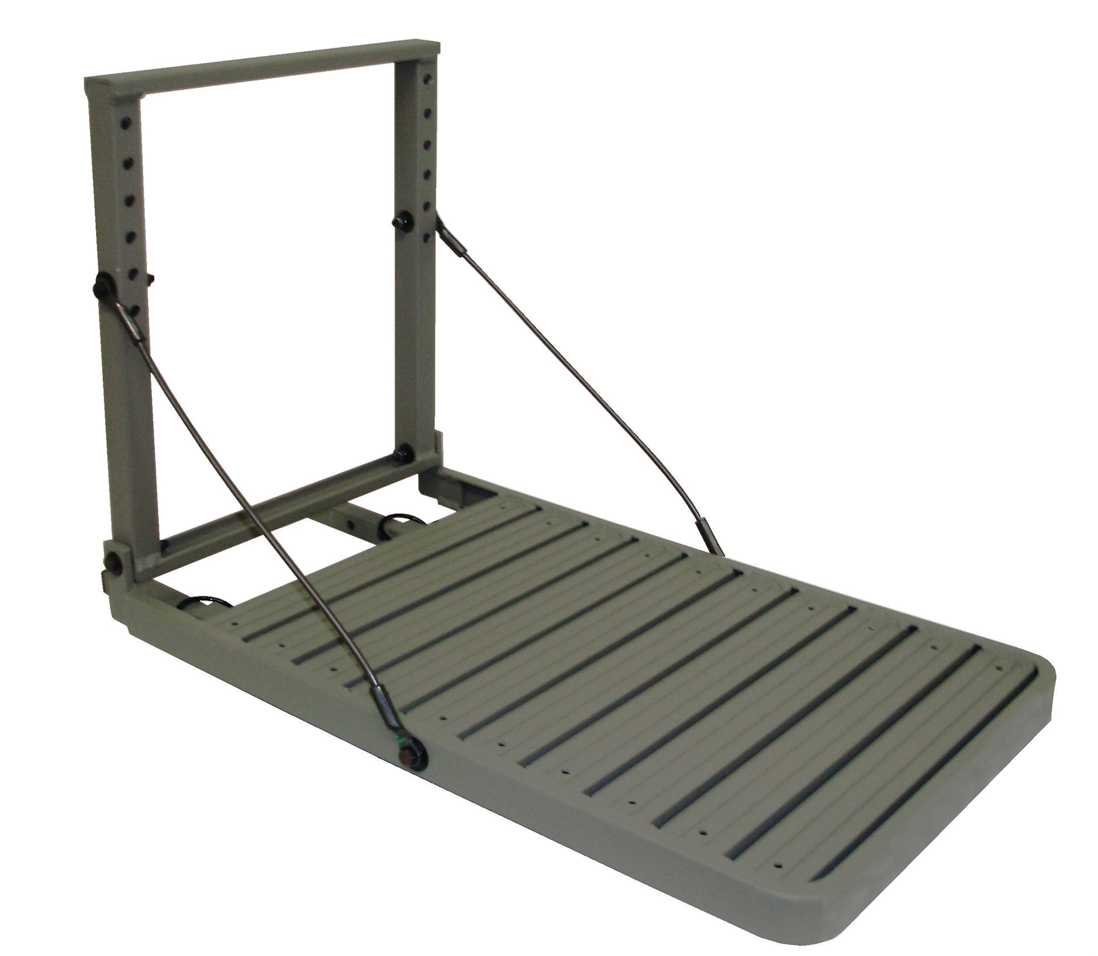 The Load-A-Pup is constructed of aircraft aluminum and weighs only 7 lbs. With use of super-strong aircraft suspension cables, it will handle any size dog. It folds completely flat and compact for easy storage when not in use. The 14” X 20” platform is the perfect size for the job and is designed with gripping ridges to provide sure-footing and protection from injury to the dog’s feet. The Load-A-Pup comes with a super-tough powder-coating in earth-tone gray for perfect concealment.