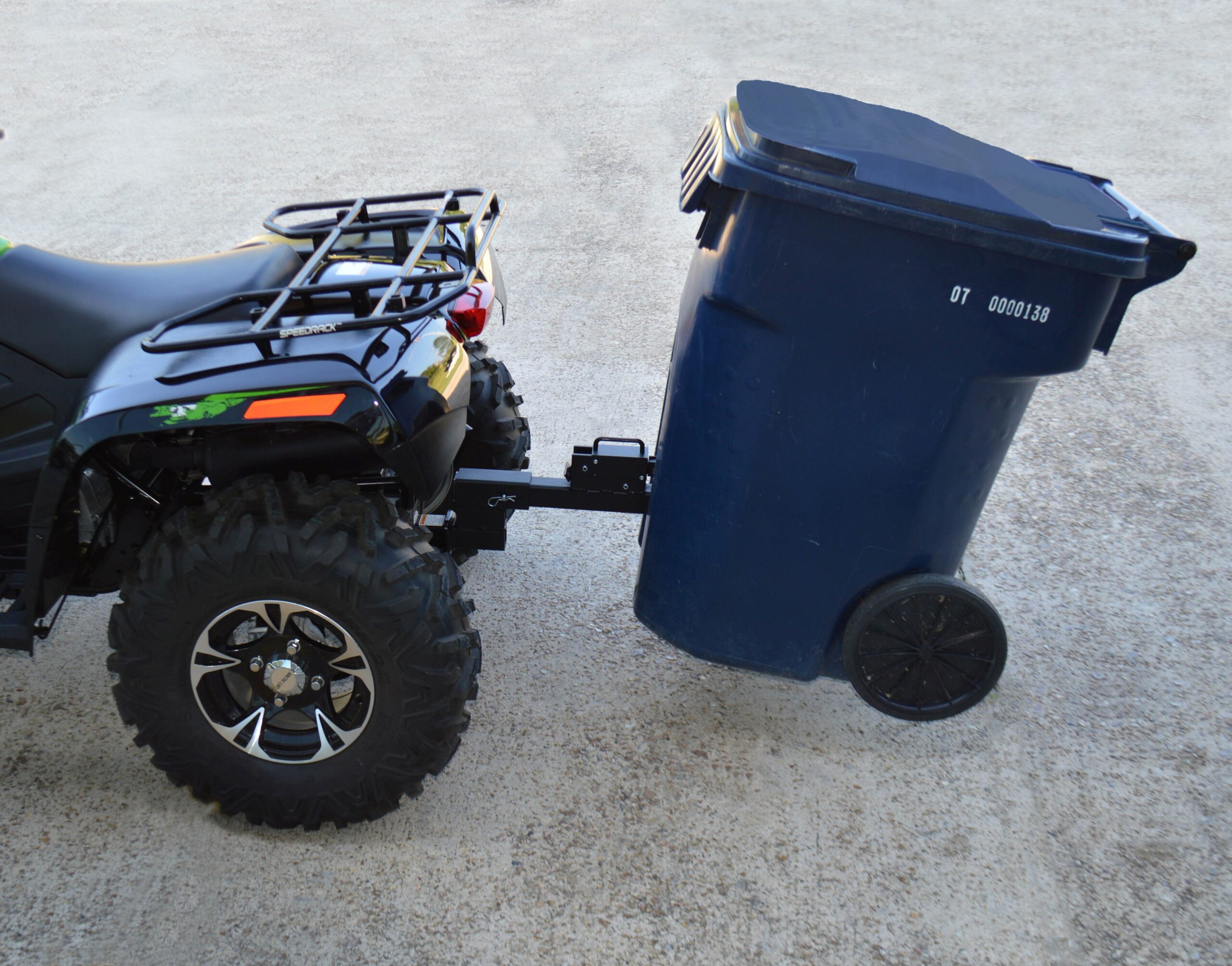 The Tote Caddy fits into standard 2” hitch receivers and is cleverly designed to attach to the handle of the universal trash cans used by all waste disposal services. With the simple flip of a lever, the receiver arm of the Tote Caddy moves into place for attaching to the can. This arm is also adjustable up to 3” to allow for any height issues. (The TC5000A may still be needed if the adjustment needs to be more than 3”.) Once attached, it is positioned slightly off the ground and ready for delivery. The TC5000’s weight capacity is 200 lbs.